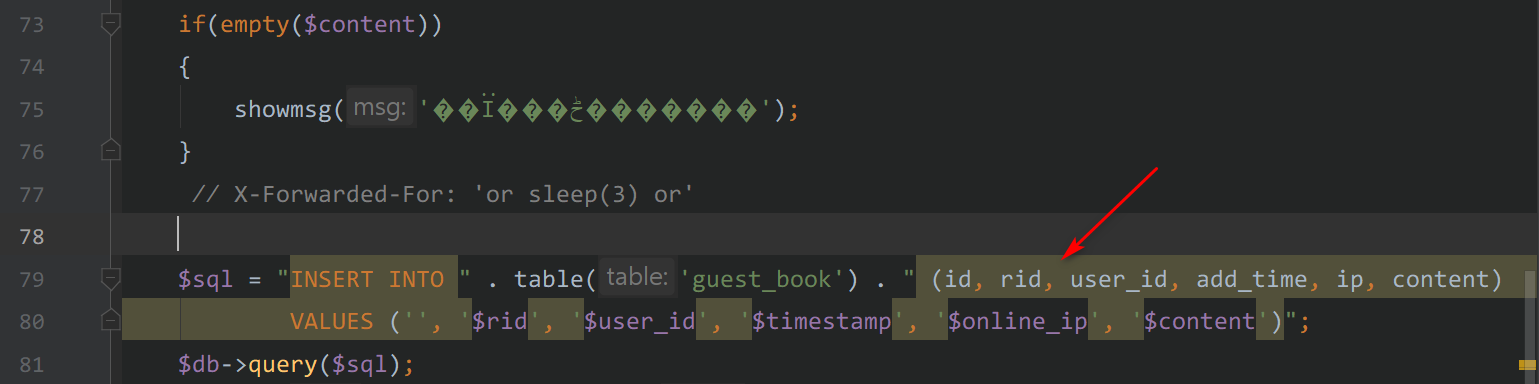 在79行中的sql语句中,可以看到插入的值中拼接了很多变量,经过分析,这里有两个变量可控,一个是$online_ip和$content。
