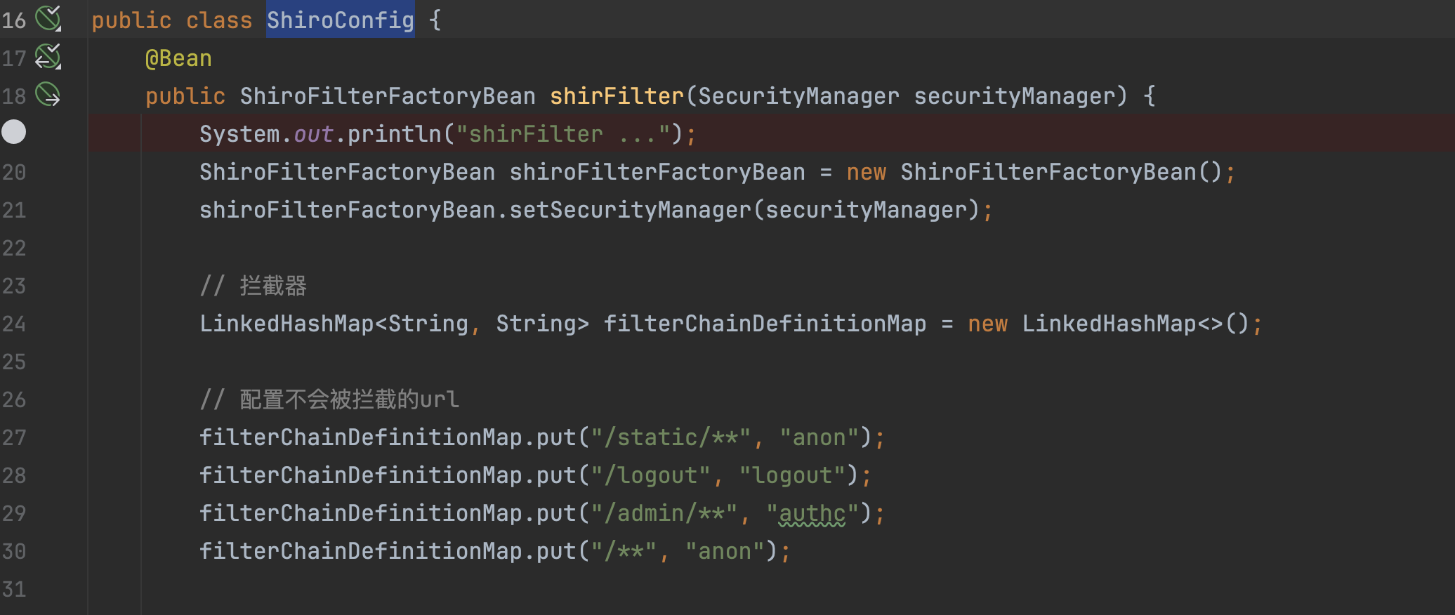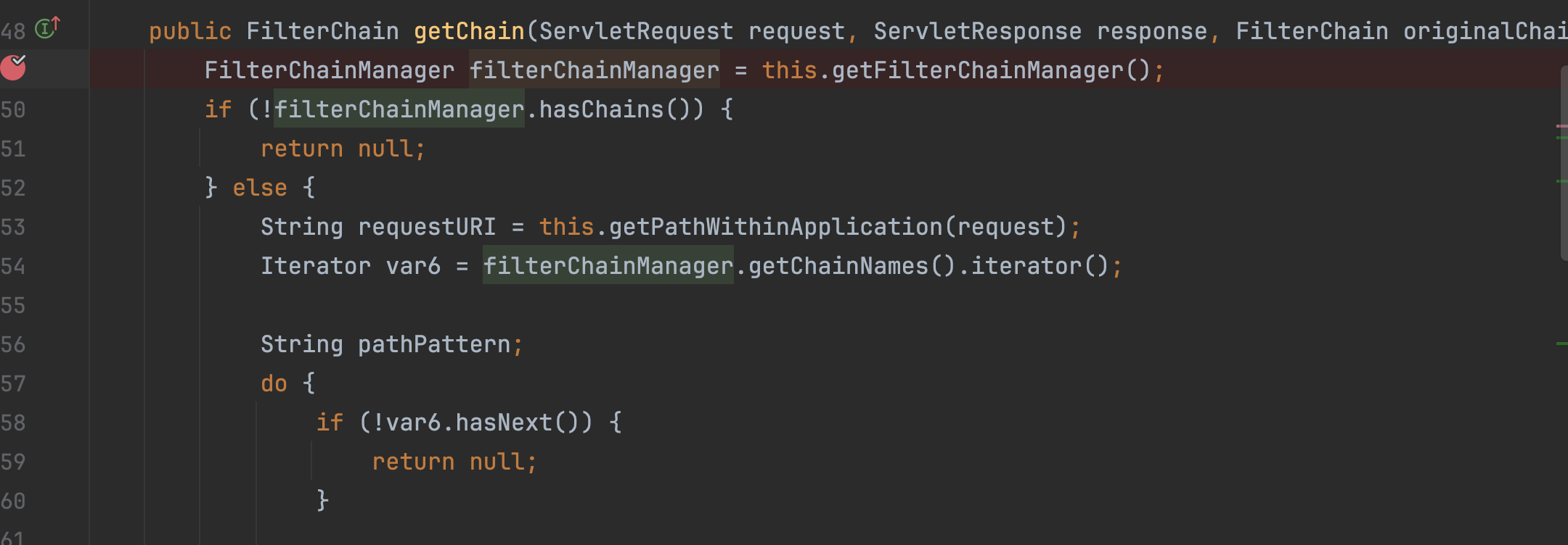 断点打在org.apache.shiro.web.filter.mgt.PathMatchingFilterChainResolver#getChain方法中,首先是获取过滤器链管理对象FilterChainManager,然后调用this.getPathWithinApplication(request)获取请求的URI