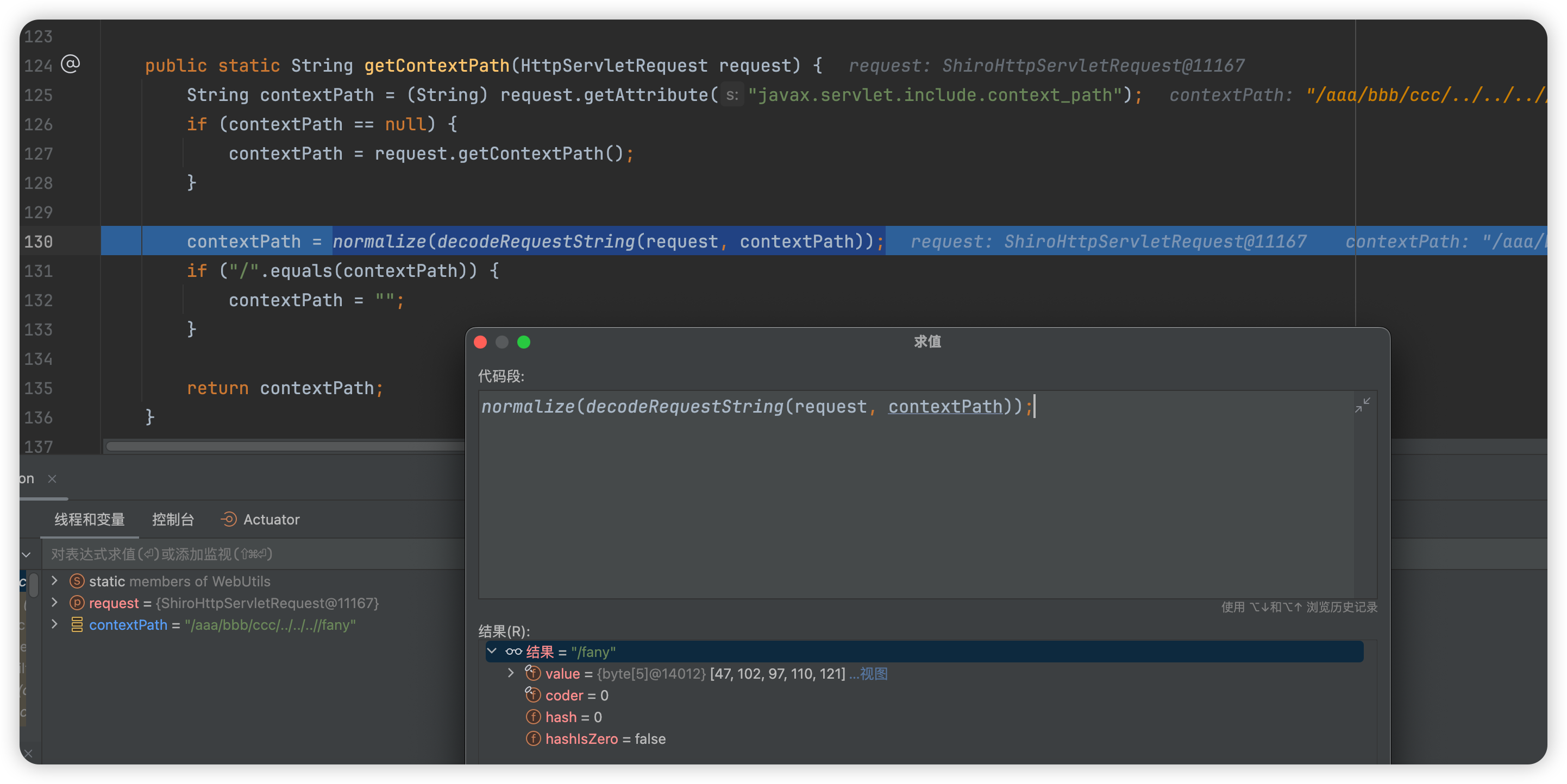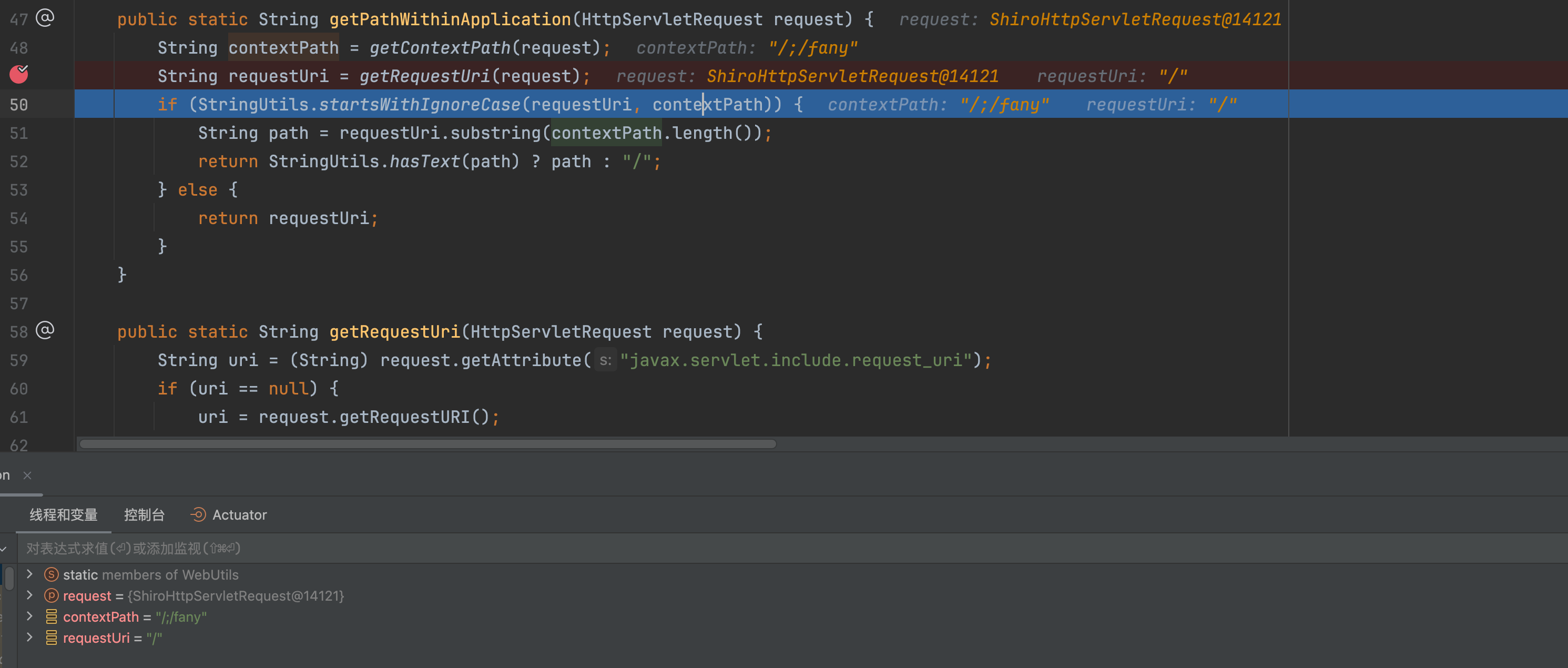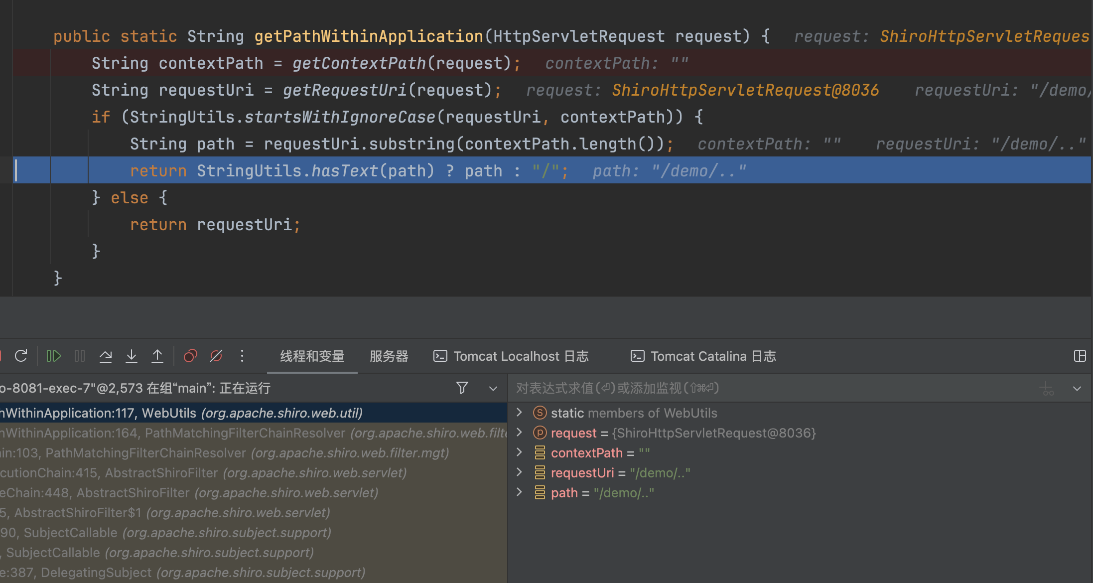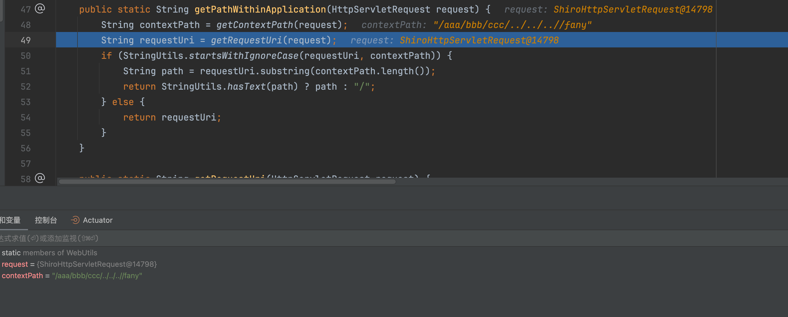 跟入后,在org.apache.shiro.web.util.WebUtils#getPathWithinApplication方法中,首先会调用getContextPath方法拿到contextPath