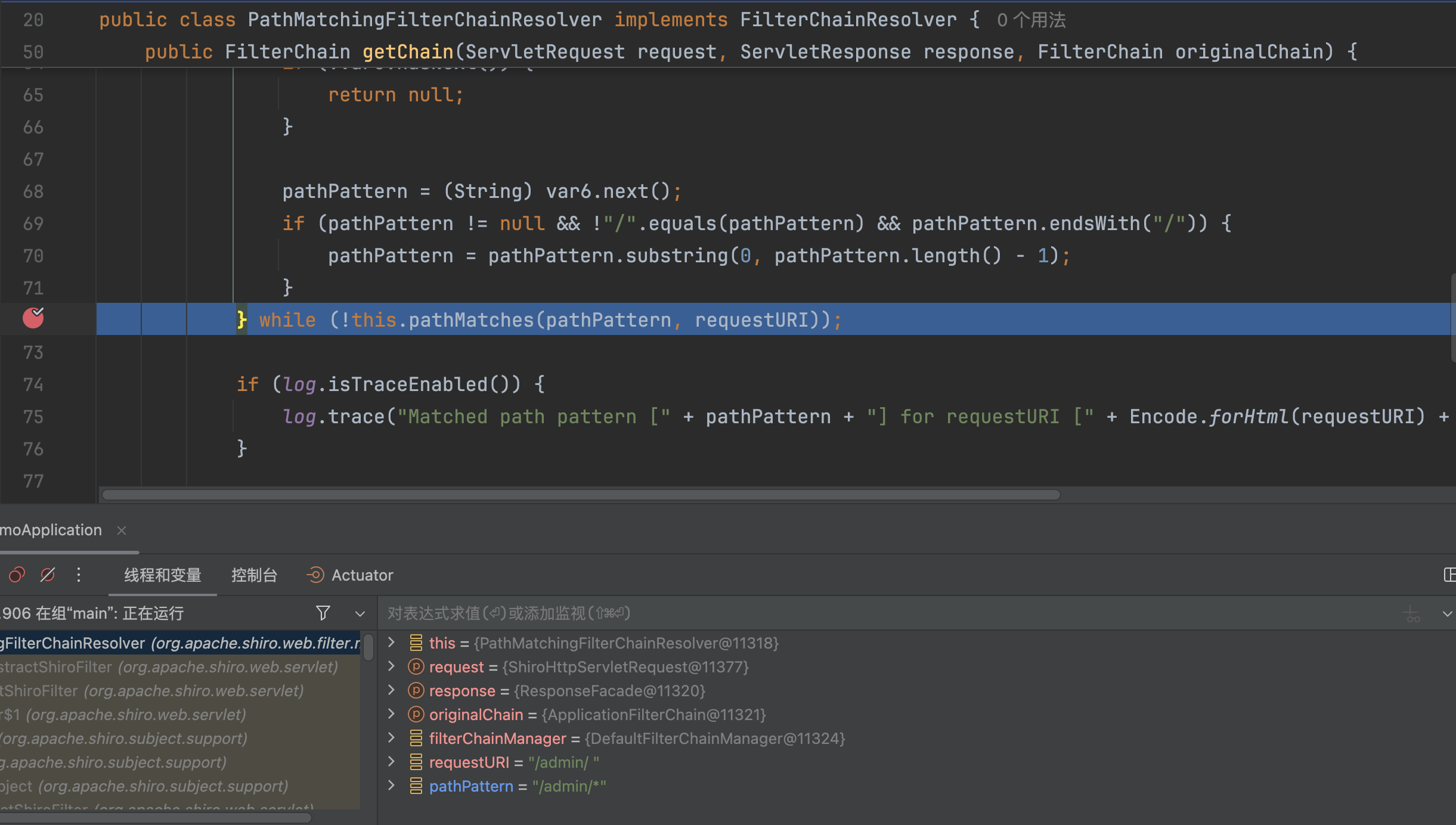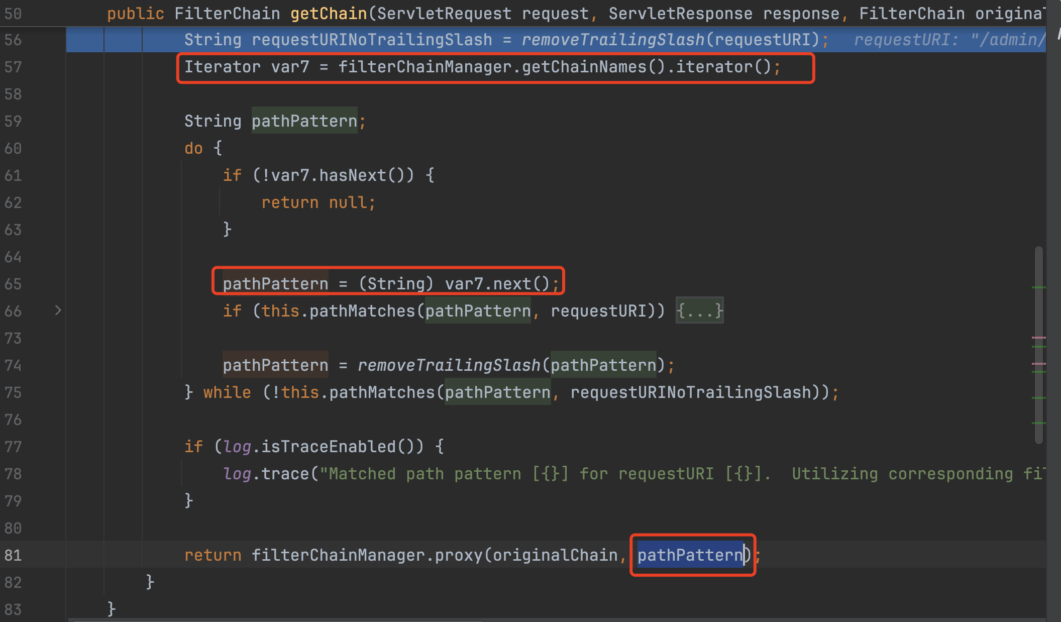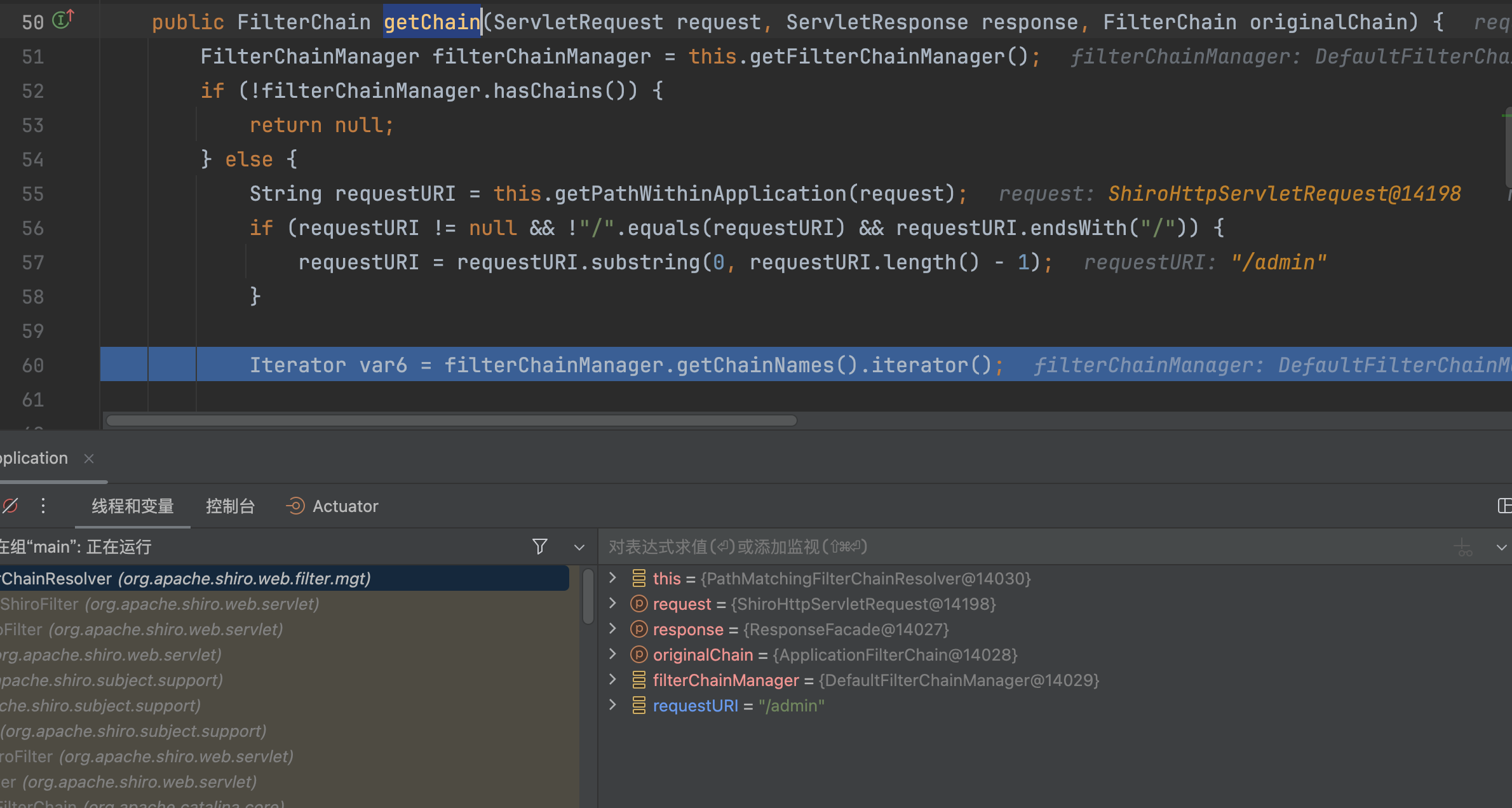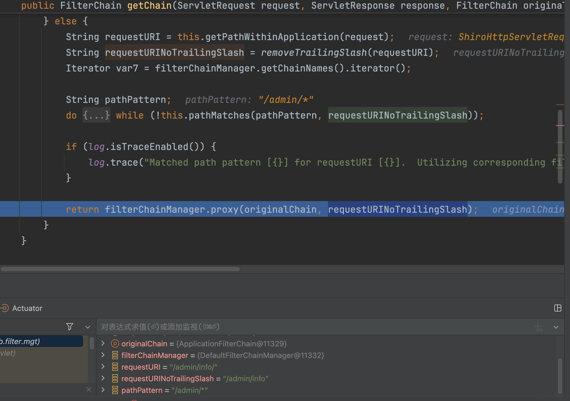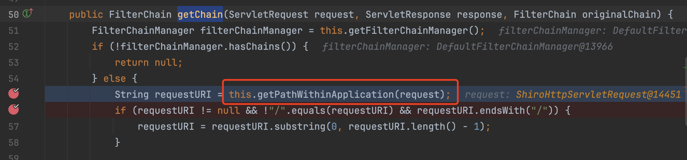 断点打在org.apache.shiro.web.filter.mgt.PathMatchingFilterChainResolver#getChain方法中,首先是获取过滤器链管理对象FilterChainManager,然后调用this.getPathWithinApplication(request)获取请求的URI