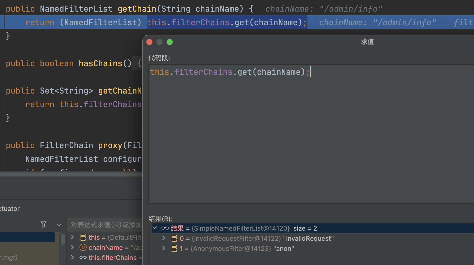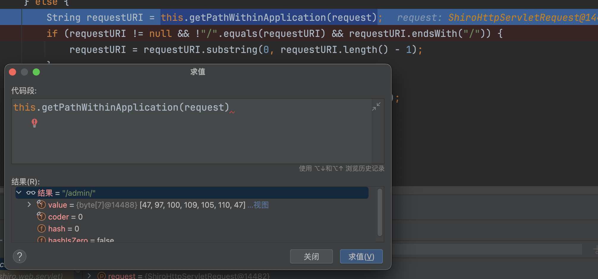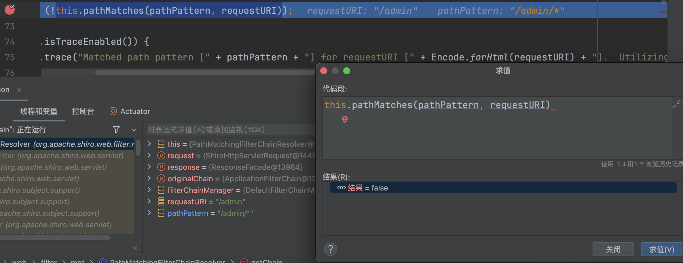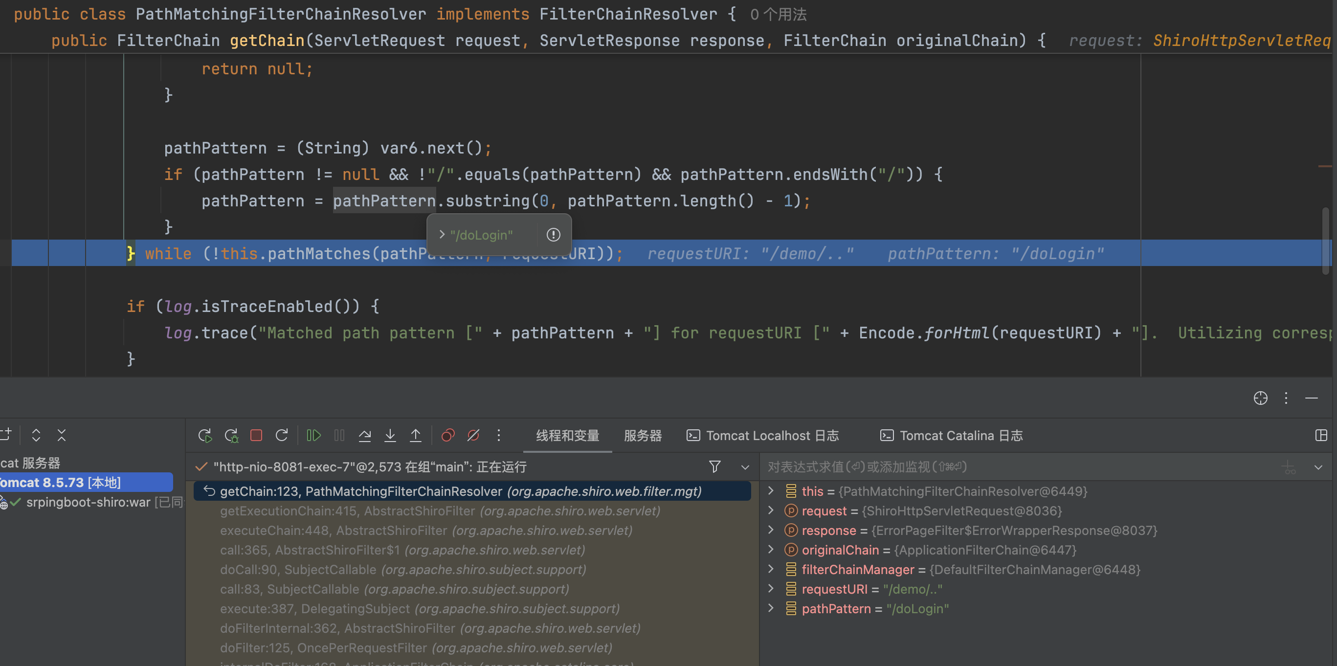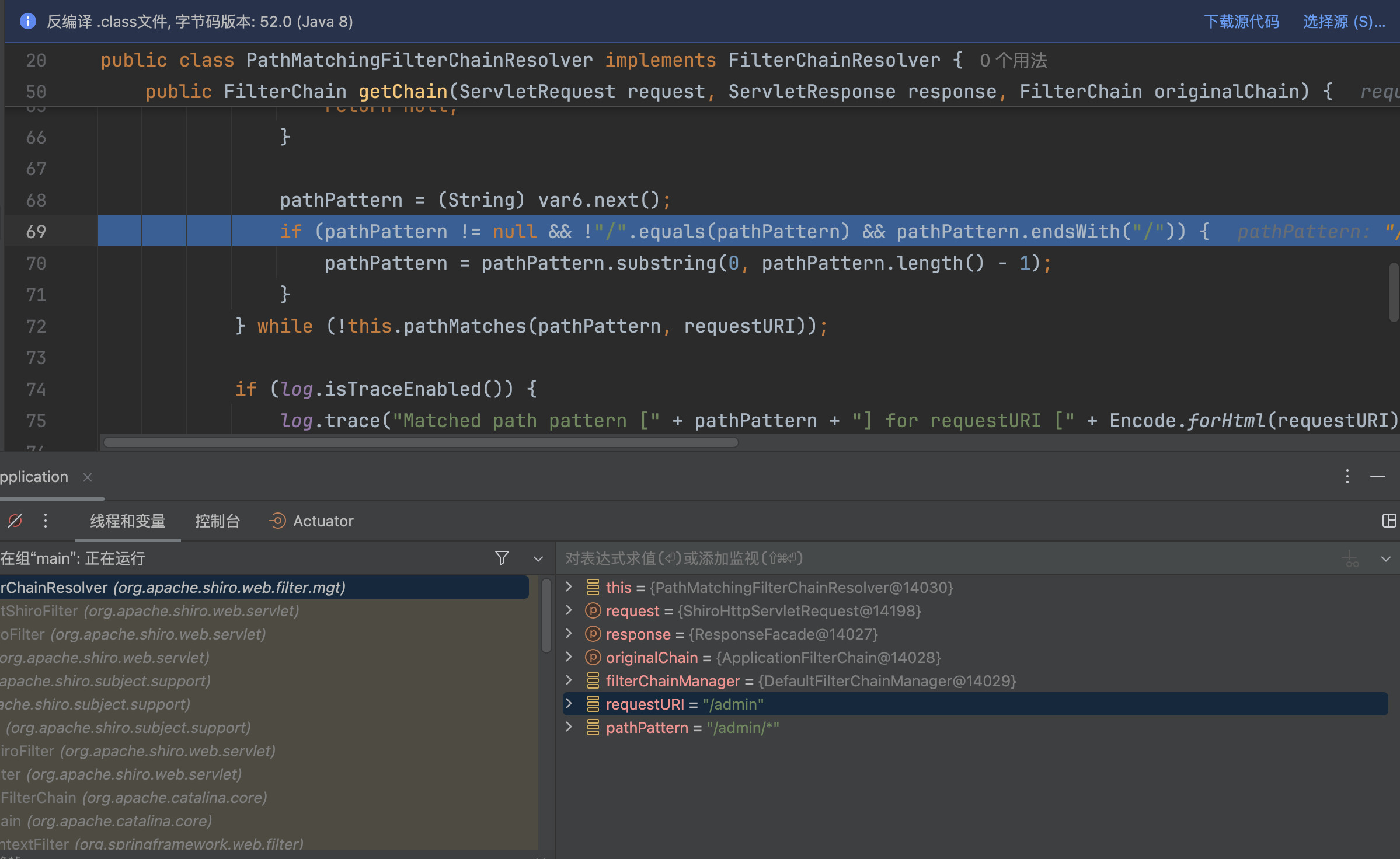 断点打在org.apache.shiro.web.filter.mgt.PathMatchingFilterChainResolver#getChain方法中,首先是获取过滤器链管理对象FilterChainManager,然后调用this.getPathWithinApplication(request)获取请求的URI