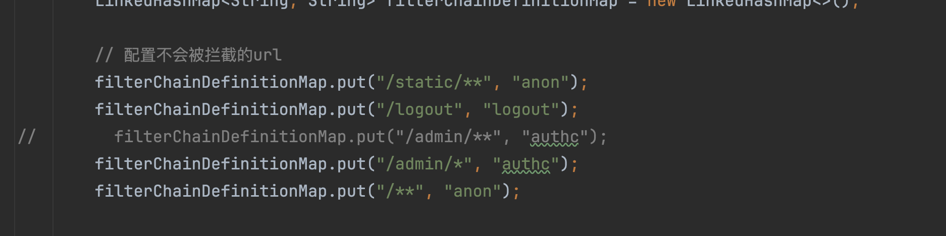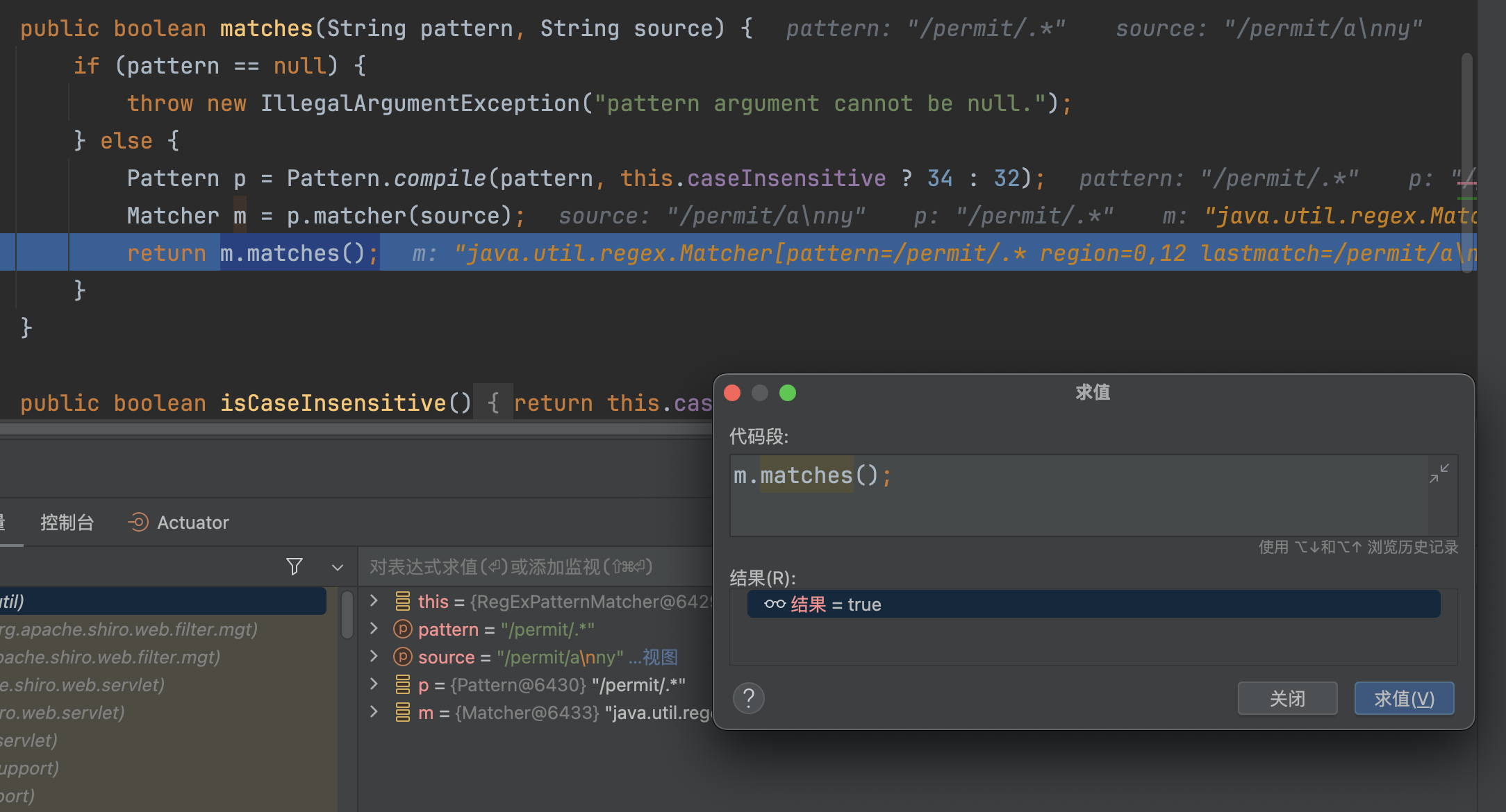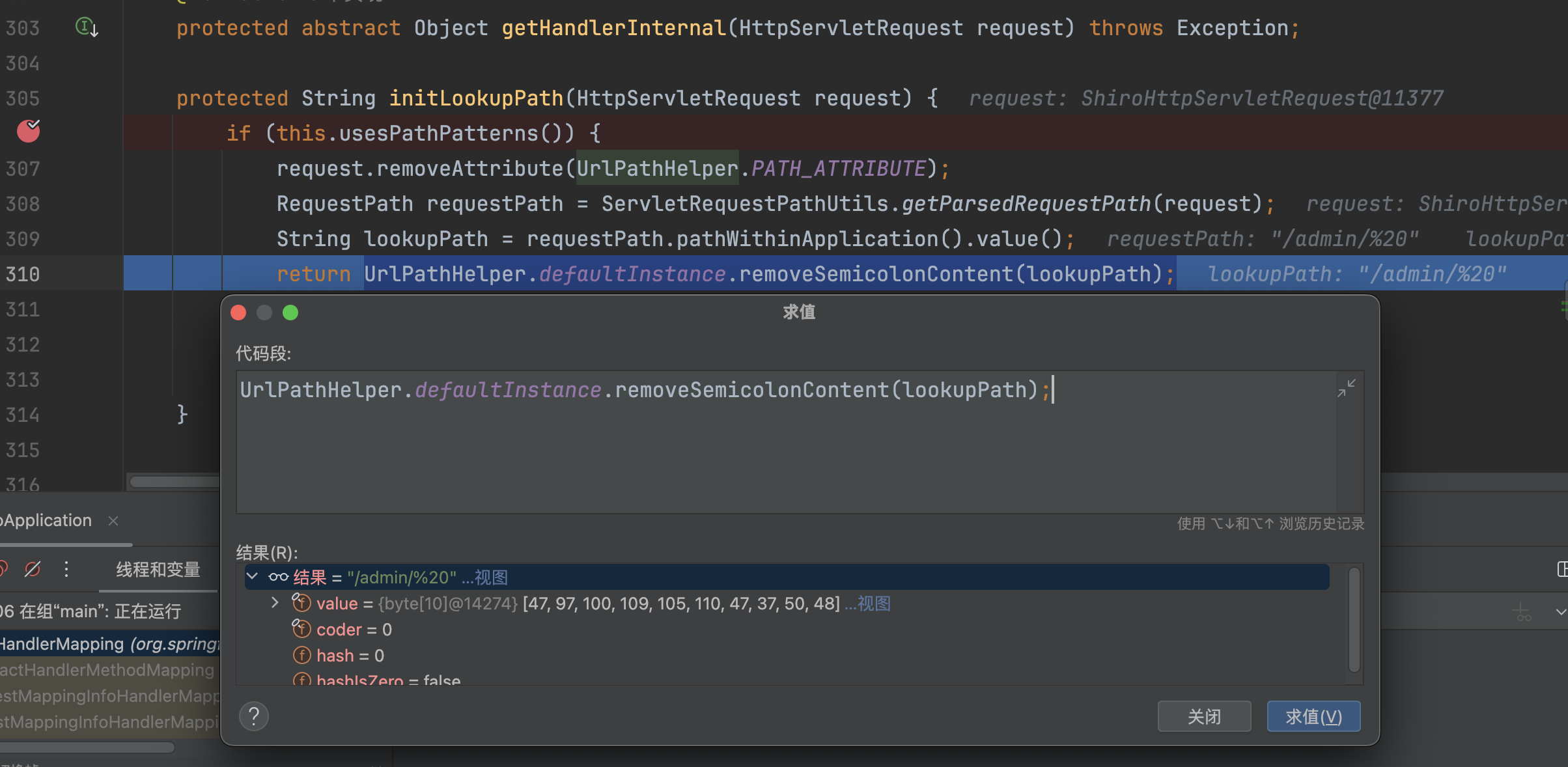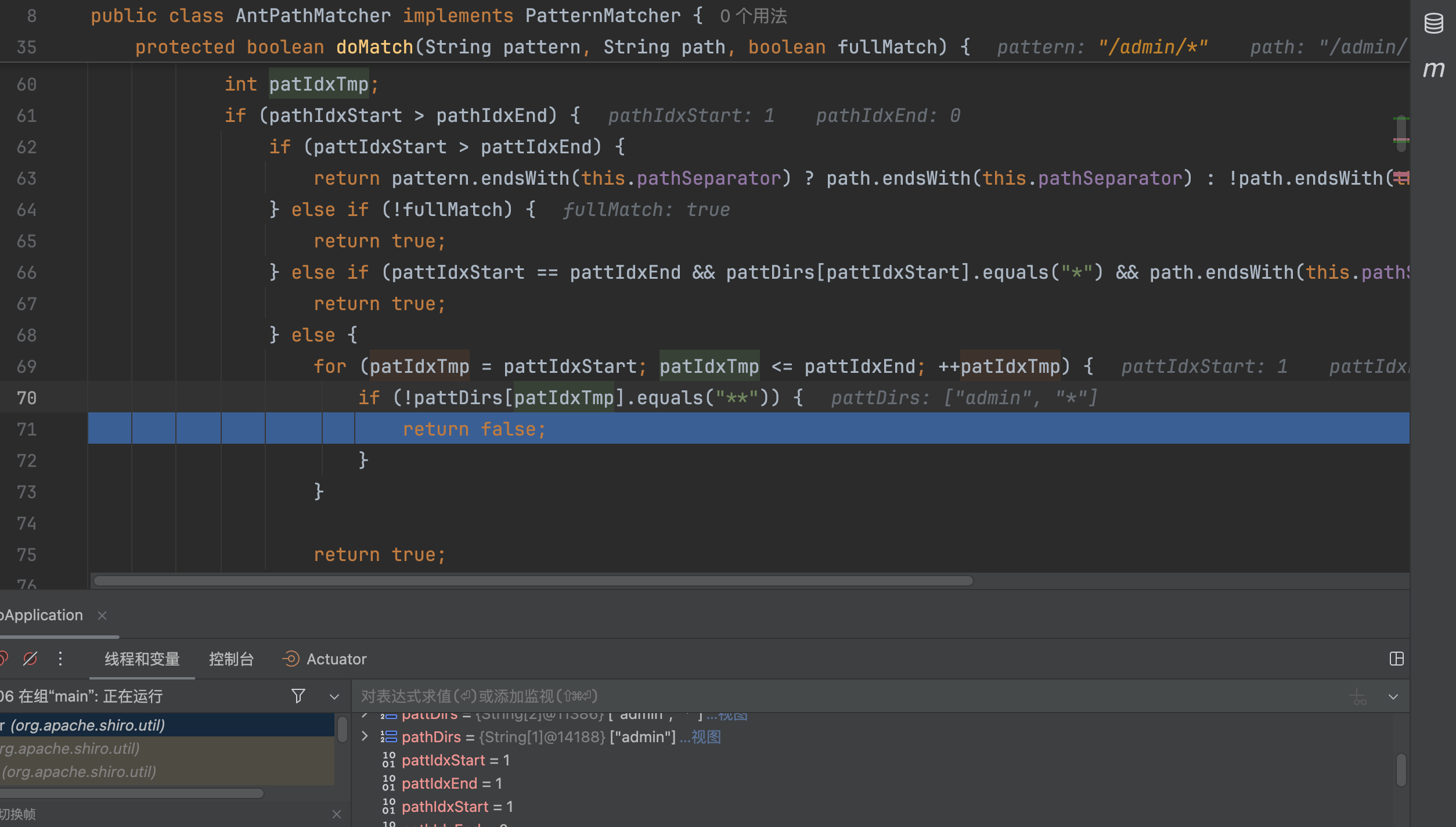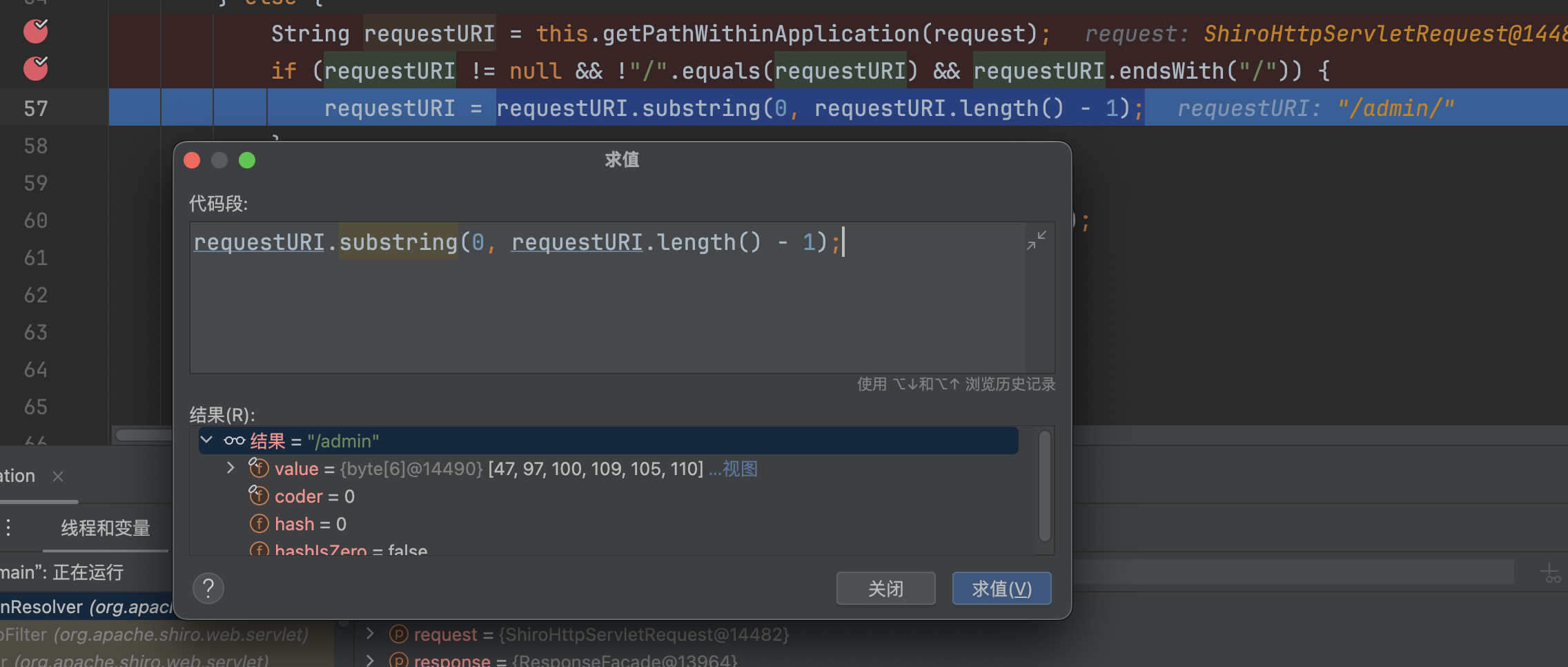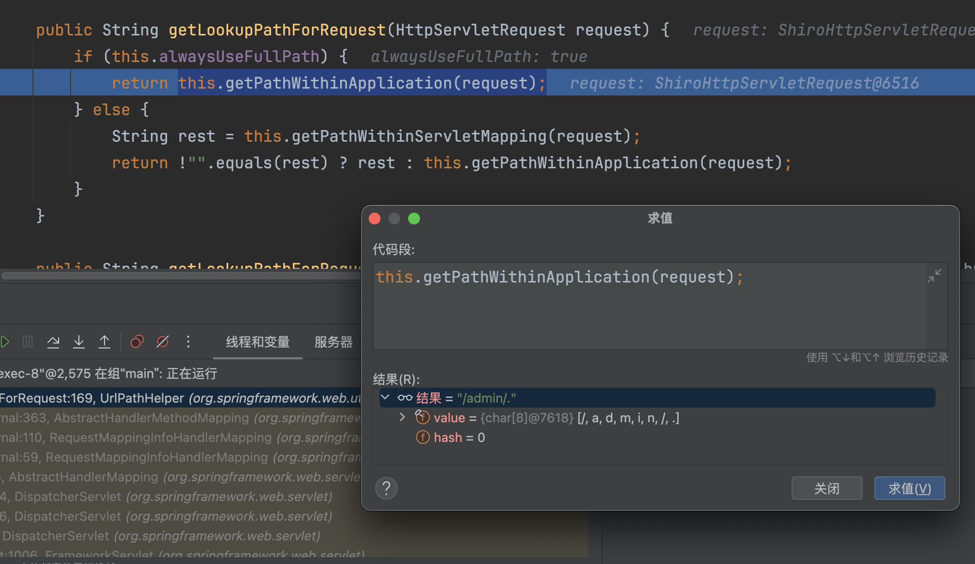 断点打在org.apache.shiro.web.filter.mgt.PathMatchingFilterChainResolver#getChain方法中,首先是获取过滤器链管理对象FilterChainManager,然后调用this.getPathWithinApplication(request)获取请求的URI